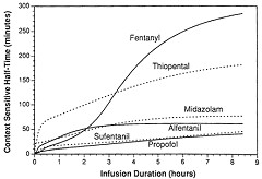 レミフェンタニルほどCSHTが短く、時間がたっても変化しないものが出てくると、これまで、それほど気にならなかった(?私は気になっていたが…)プロポフォールが意外とくせ者だということがご理解いただけるでしょうか。