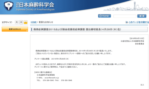 日本麻酔科学会の偶発症例調査2015および肺血栓塞栓症例調査の提出締切が4月28日(木)まで延長されています。■日本麻酔科学会…