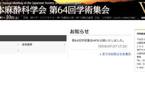 日本麻酔科学会第64回学術集会のサイトが立ち上がっています。日本麻酔科学会第64回学術集会は、2017年6月8日(木)〜10日(土)に神戸で開催されます…